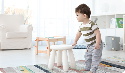 By the age of 18 months, most babies are starting to walk independently taking uneven steps, with their feet wide apart and arms held out for balance. They will transition from standing to sitting by collapsing backwards with a bump, or by falling forwards onto their hands and then push themselves back to sitting. They may be able to climb upstairs and then come back down backwards.