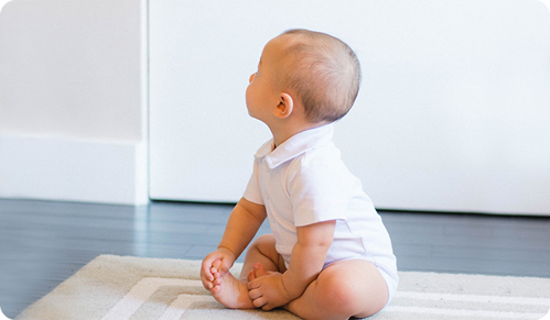 Motor skills: starts to sit without support; may start crawling (9 months +); pull to standing; will purposefully move alternate feet when held in a standing position; reaches for toys without becoming unbalanced.
